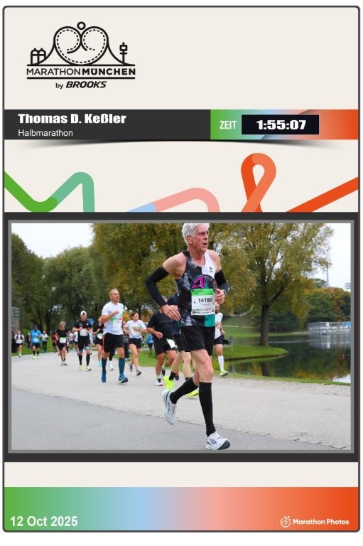 Unter den 10.742 Zieleinläufern beim Halbmarathon in München auch Thomas Kessler. Immer in einem dichten Läuferpulk laufend absolvierte er die abwechslungsreiche Strecke durch die Innenstadt mit Start und Ziel im Olympiapark in 1:55:07 Stunden.